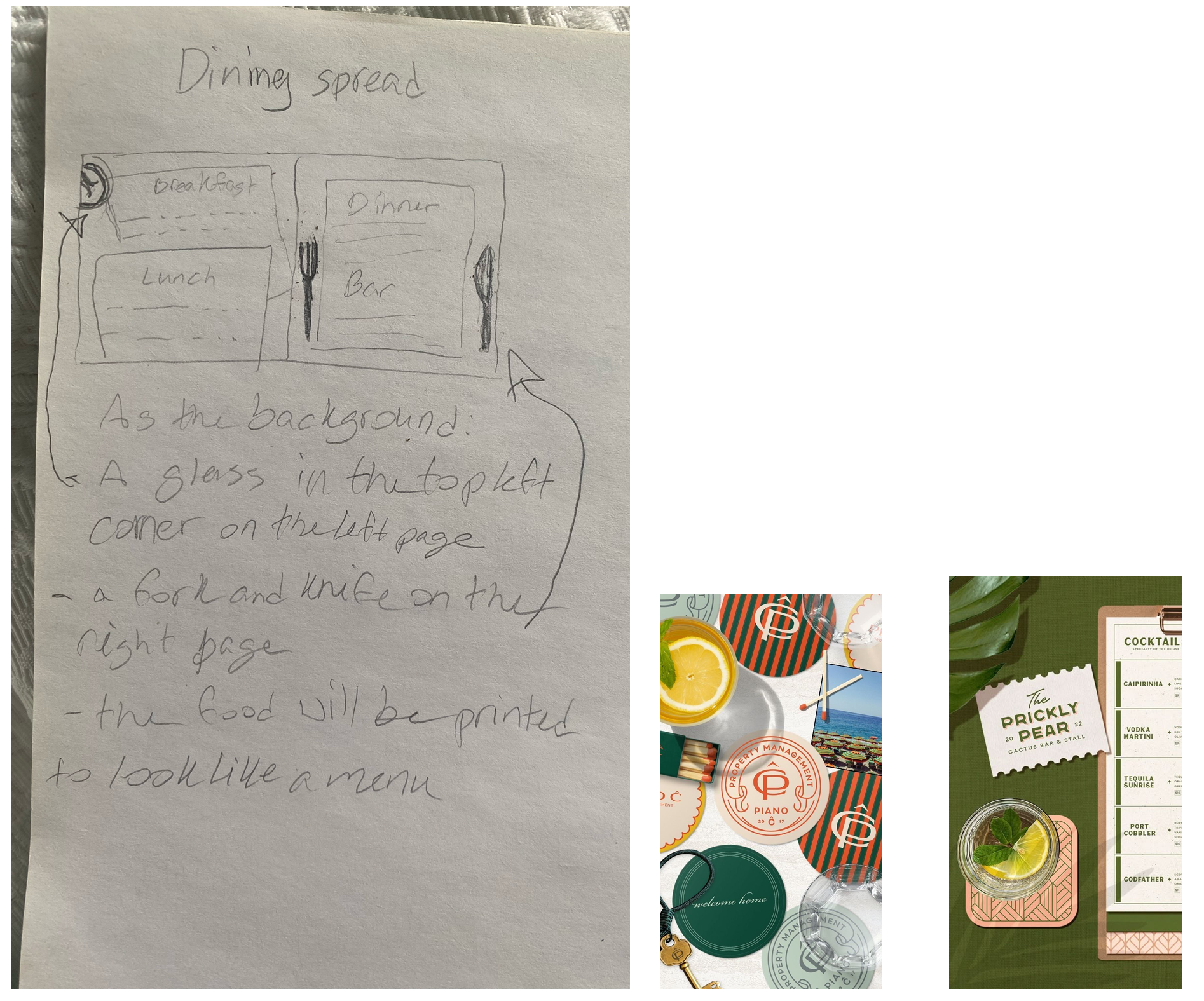 The food listed will be printed on a menu. The breakfast will be below the lunch menu on the left page. The dinner and drinks will be on one menu on the right page.