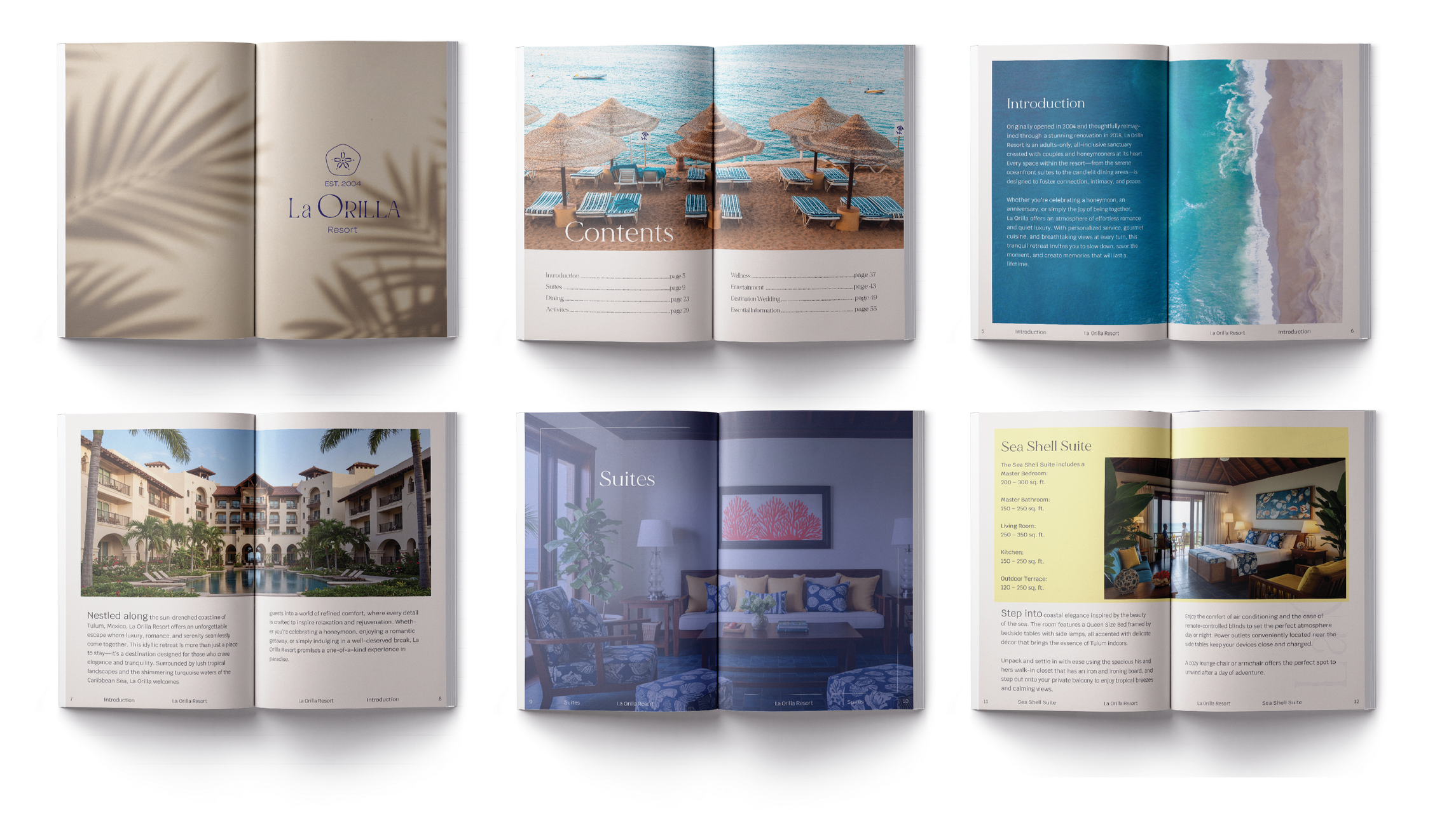 The La Orilla Resort catalogue is designed to promote the luxury seaside resort as the ultimate summer destination for couples. The catalogue invites vacationers to book their dream getaway by highlighting the resort’s accommodations, which range from breathtaking views and romantic atmospheres to fun and adventurous activities.
