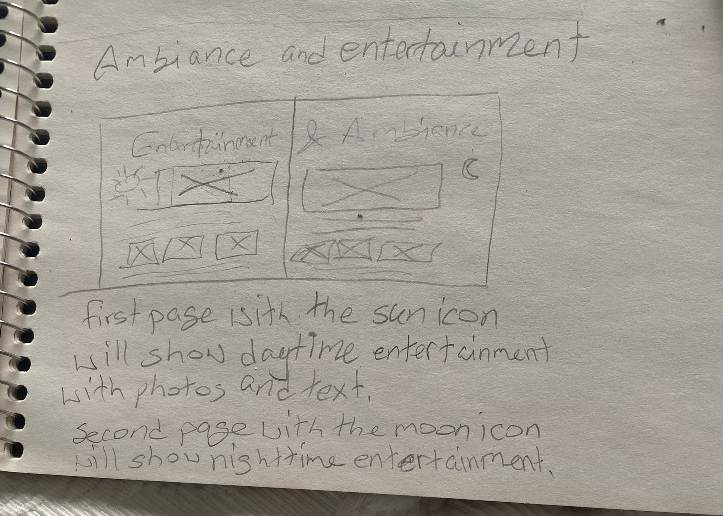 The second page will have a moon icon to show the nighttime entertainment with photos and text describing each. Like a nighttime dj, live performances... etc.