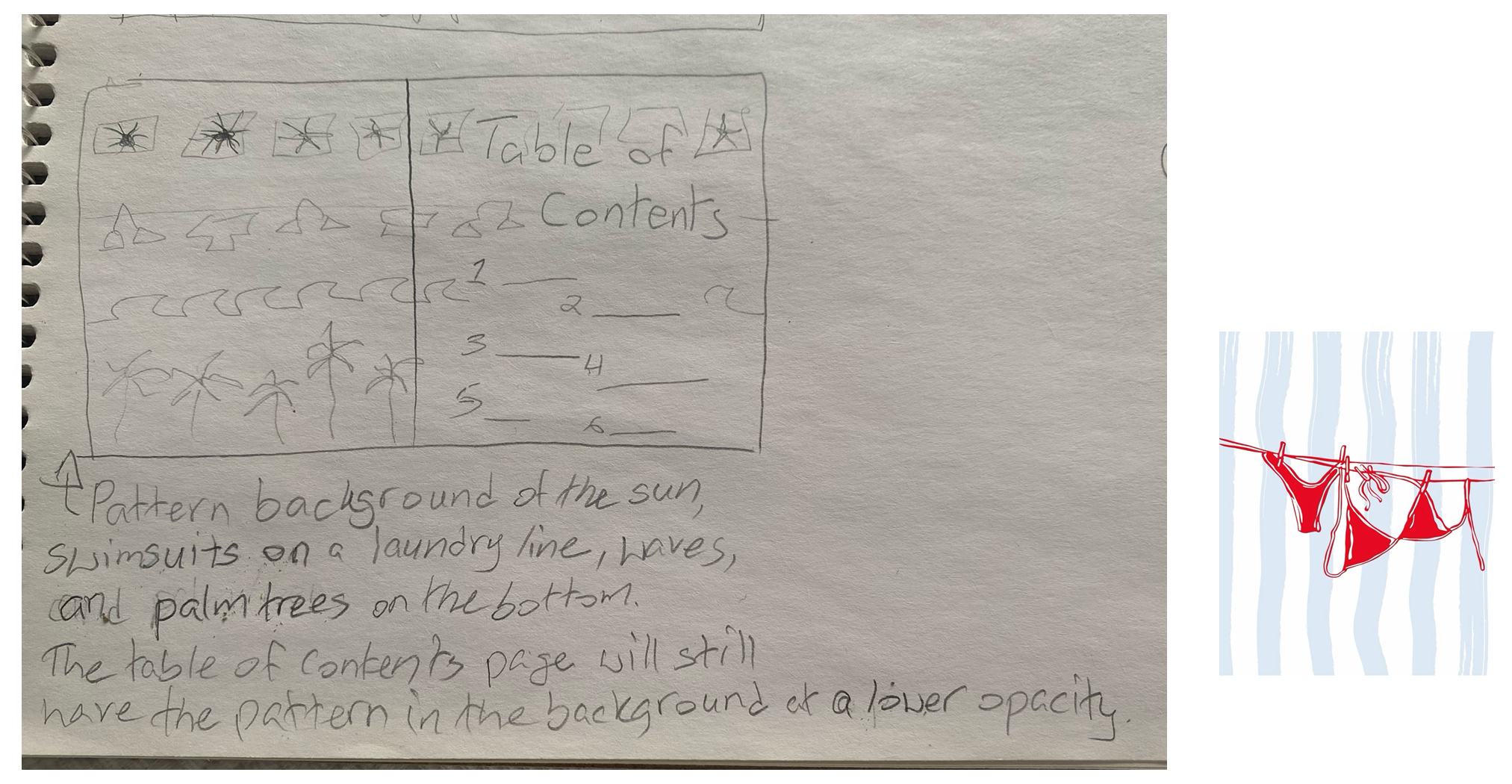 The pattern background will be of the sun, swimsuits on a laundry line, ocean waves, and palm trees at the bottom of the page.