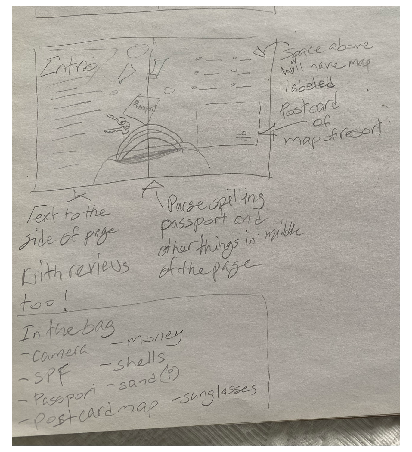 Bag spill in the middle of the page with passport and other summer necessaries out of the bag.
